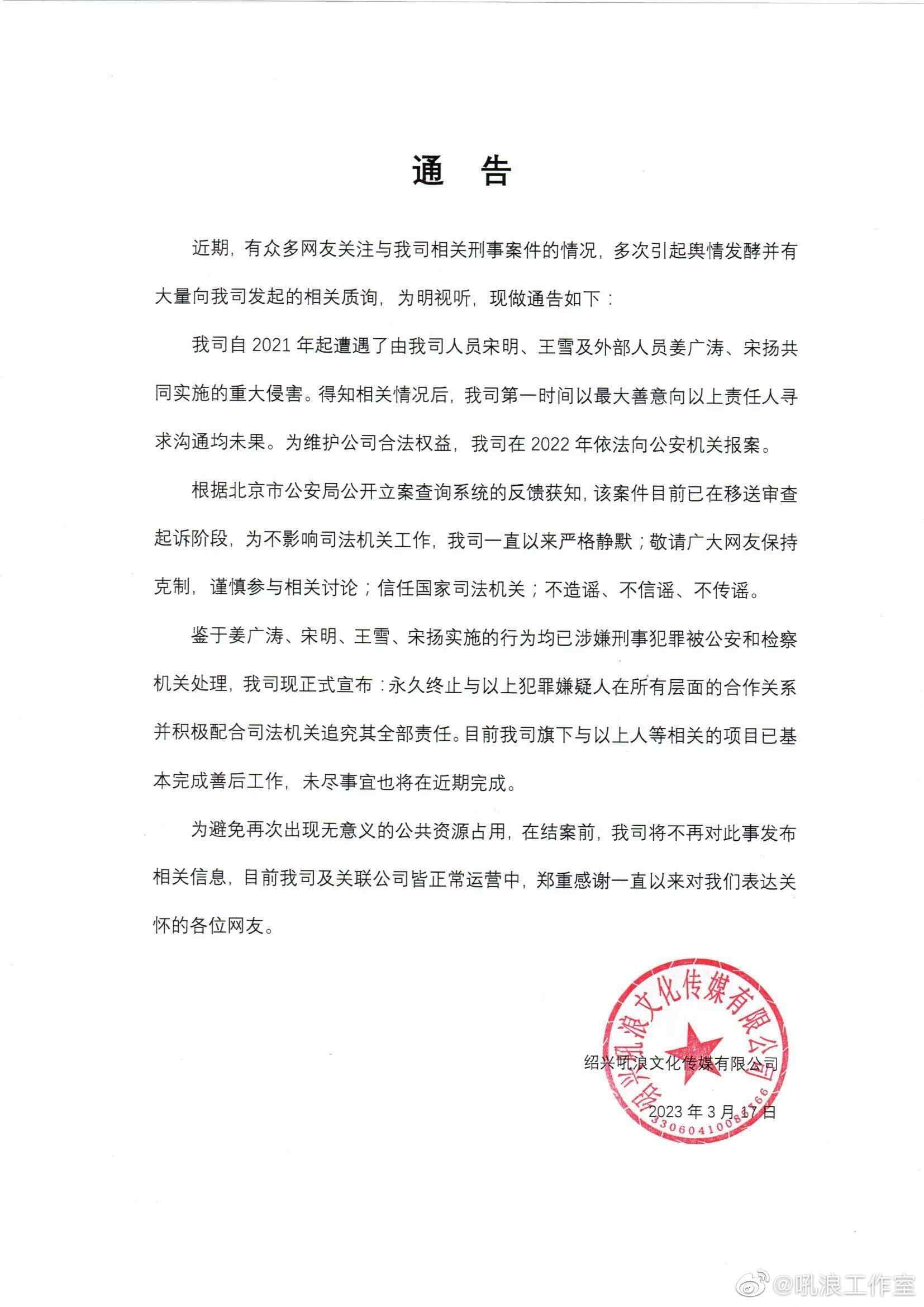 近期,我们关注到网络平台中部分账号主体针对我司刑事案件,我司及关联公司、关联人发布诸多诽谤及侮辱的负面言论,特此声明。同时,就我司人员宋明@cucn201宝木中阳 ,王雪及外部人员姜广涛@姜广涛 、宋扬的刑事案件情况,特此通告。