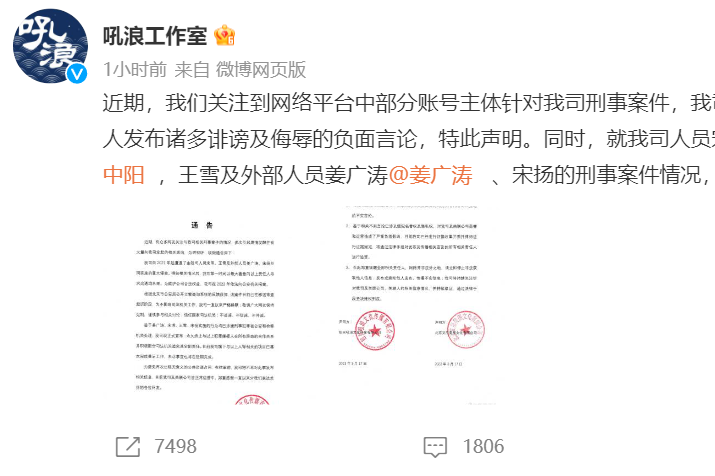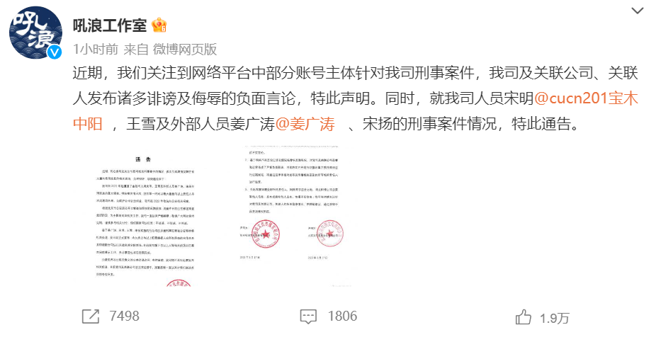 今天(3月17日)下午,吼浪工作室在微博发布通告,内容如下:
