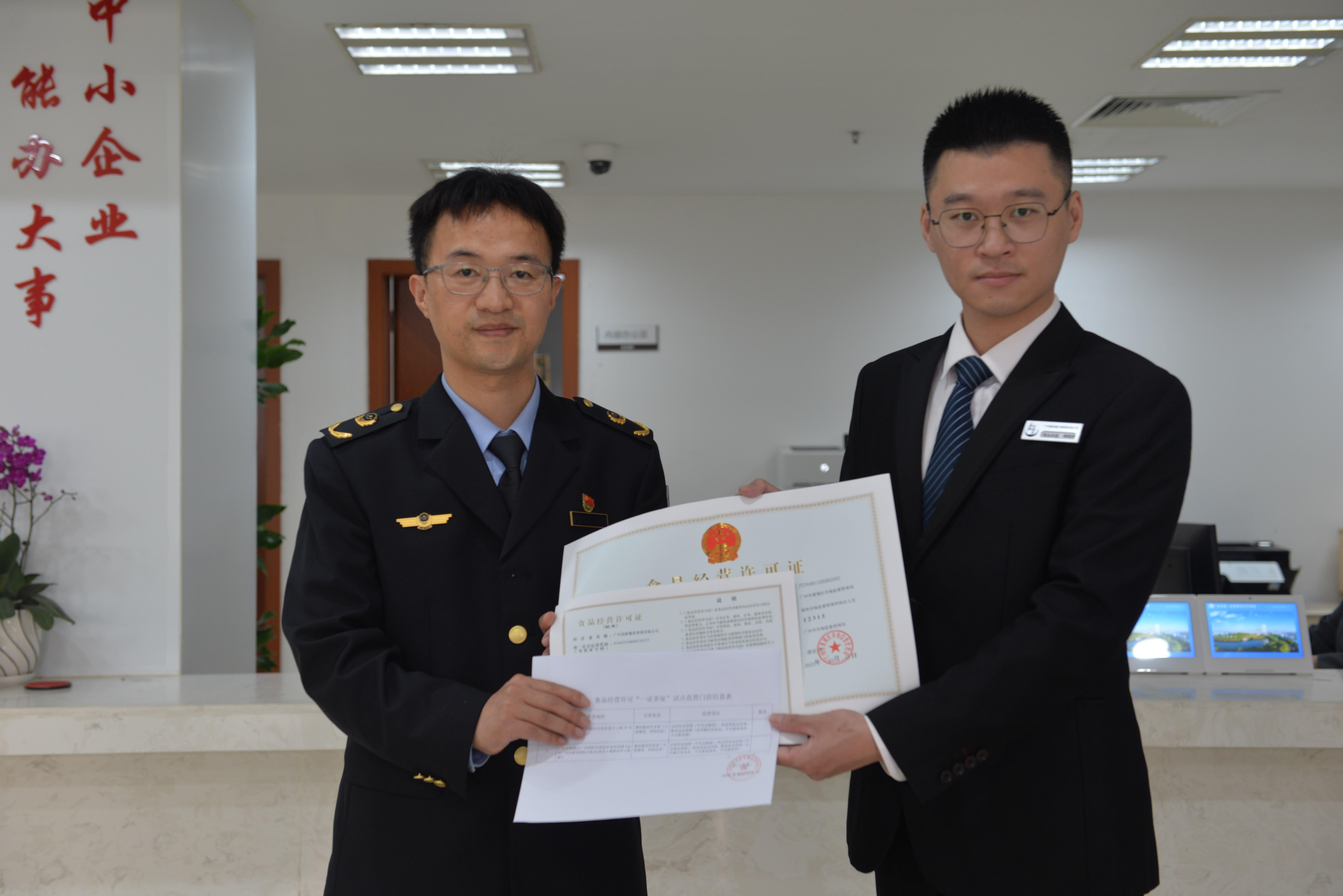 3月17日,广州高新餐饮管理有限公司在黄埔区政务服务大厅办事窗口领到了“一证多址”食品经营许可证,成为广东省首家享受到“一证多址”改革红利的企业。