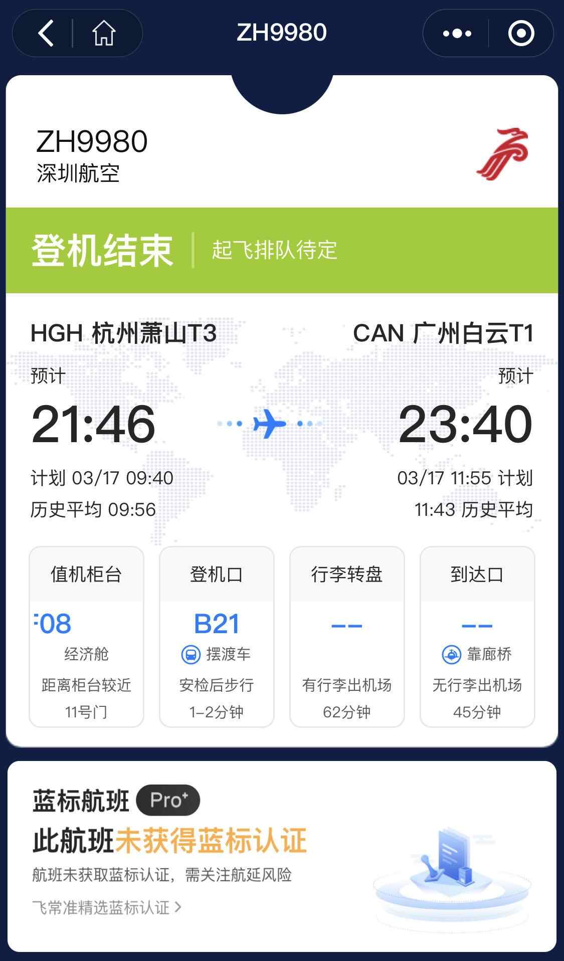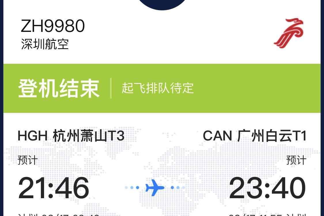 但据记者18时26分查询飞常准,ZH9980航班已经登机结束,正排队起飞,预计17日20时29分到达广州白云机场。