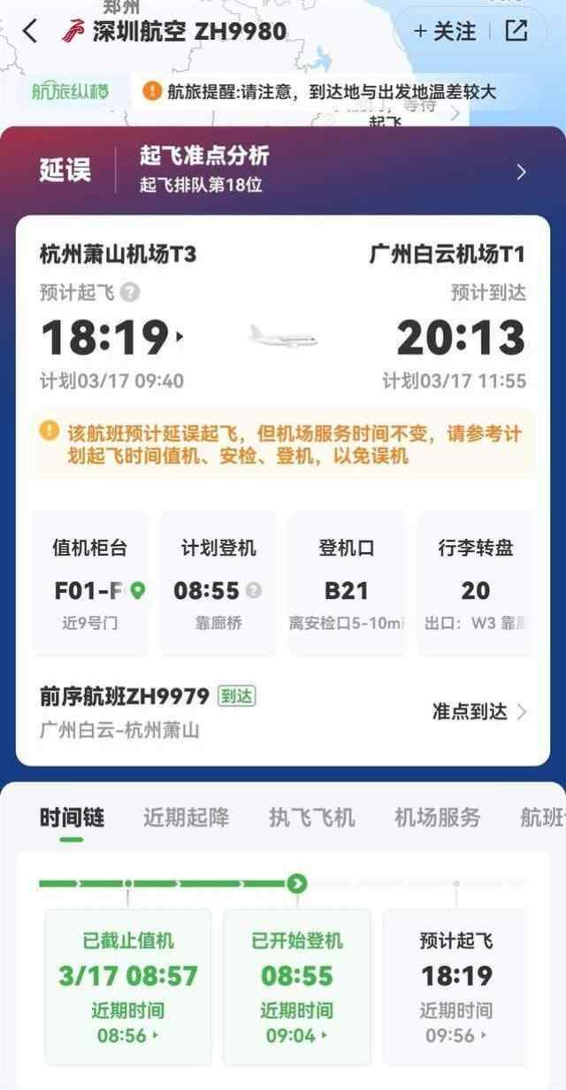 记者了解到,这趟航班ZH9980原计划于3月17日上午9时40分出发,11时55分抵达广州。航旅纵横客户端显示,航班于当天上午8时55分开始登机,但出现延误,预计起飞时间是下午6时19分。