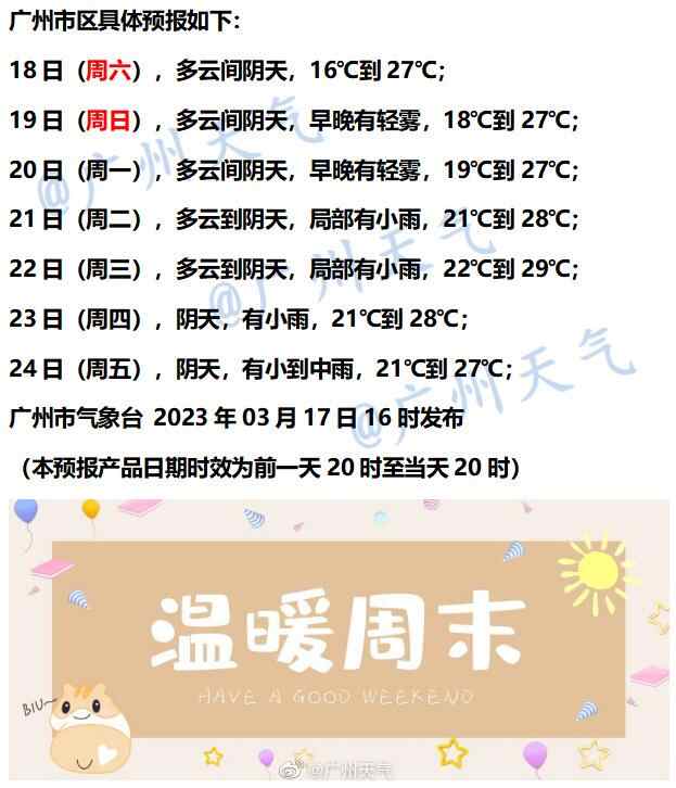 19-20日,西部市县多云到阴天有分散或零星小雨,早晚有轻雾;其余市县多云间阴天。最低气温:韶关北部、清远北部和肇庆北部市县14℃~17℃,其余市县18℃~22℃。