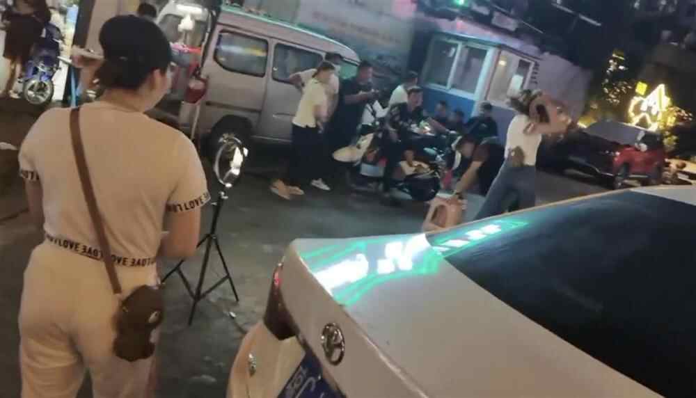 视频中,女子不停地说:“打你,一定要打你,一定要打掉你,噼里啪啦打你。”附近支架上的手机正在直播,女子偶尔会与网友互动。路过的行人和骑电动车的人,纷纷驻足观看,或掏出手机拍照。