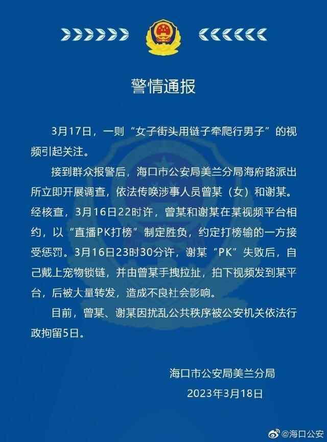 接到群众报警后,海口市公安局美兰分局海府路派出所立即开展调查,依法传唤涉事人员曾某(女)和谢某。经核查,3月16日22时许,曾某和谢某在某视频平台相约,以“直播PK打榜”制定胜负,约定打榜输的一方接受惩罚。3月16日23时30分许,谢某“PK”失败后,自己戴上宠物锁链,并由曾某手拽拉扯,拍下视频发到某平台,后被大量转发,造成不良社会影响。