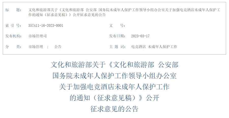 文化和旅游部、公安部、国务院未成年人保护工作领导小组办公室研究起草了《文化和旅游部 公安部 国务院未成年人保护工作领导小组办公室关于加强电竞酒店未成年人保护工作的通知(征求意见稿)》,3月17日起向社会公开征求意见。