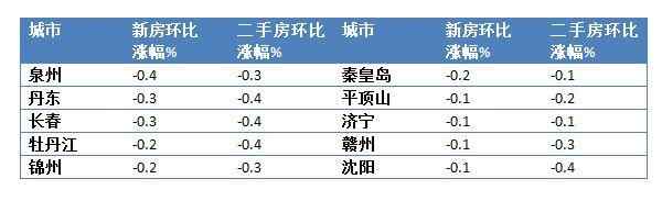 从统计局公布的数据来看,新房价格环比下跌的城市为:泉州、丹东、贵阳、长春、大连、南充、牡丹江、锦州、秦皇岛、平顶山、济宁、赣州、沈阳,其中泉州新房价格环比下跌0.4%。