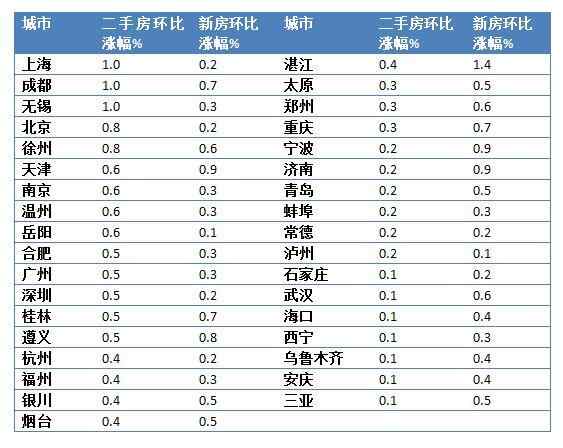 二手住宅销售价格上涨的城市分别为:上海、成都、无锡、北京、西安、徐州、天津、南京、温州、岳阳。其中,上海、无锡、成都三城环比涨幅并列第一,环比上涨1%;北京、徐州、西安次之,均环比上涨0.8%。