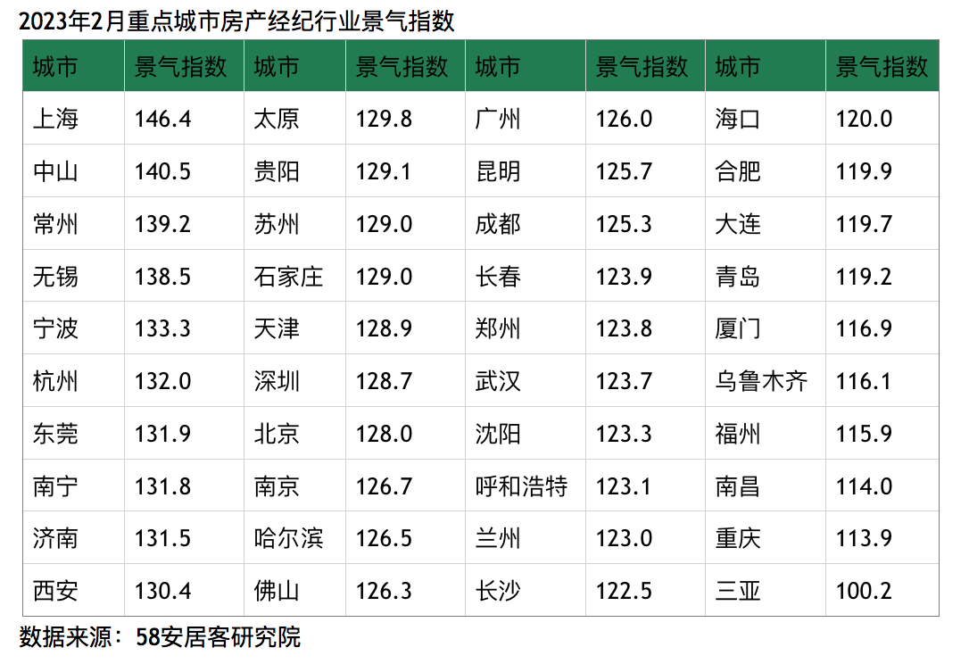 张波指出,根据58安居客研究院监测的重点城市房产经纪行业景气指数,上海、宁波、杭州、西安、深圳、广州等城市的房产经纪行业景气度呈现持续上涨态势,这也显示出一二线热点城市的市场转暖趋势明显,“小阳春”格局已经确立。从区域分布上看,长三角区域城市景气度上行比例最高,其中景气指数排名前10中,有5个是位于长三角,除了一二线城市,还包括无锡、常州两个三线城市。受节后返工影响和市场活跃度影响,行业整体表现更佳。长三角作为全国楼市无论在土地供给还是市场成交量,都占据了全国三分之一强,长三角整体区域的复苏对于带动全国楼市回暖将起到重要作用。