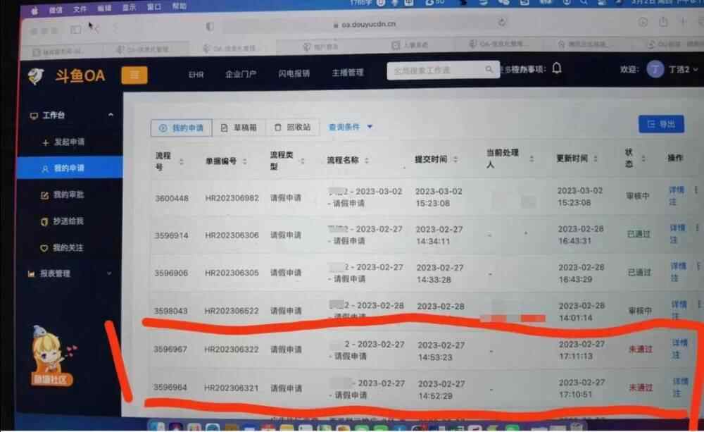 丁女士称,2月27日将相关资料提交oa系统请假,但被人力部门驳回。考虑到可能是人力部门看不懂病例资料,她在2月28日又去医院开具了一份更详细的资料提交,但人力依旧将申请驳回。