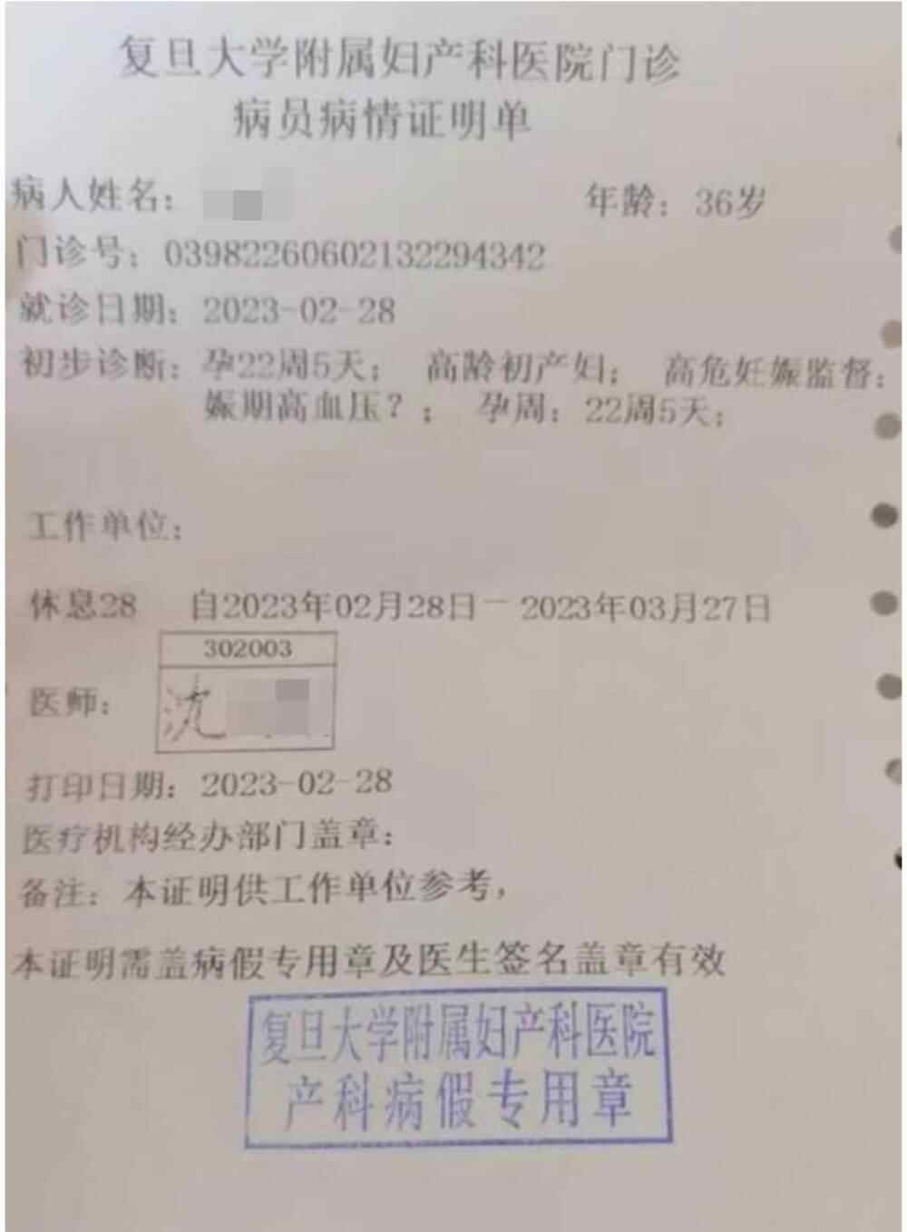 丁女士提供的产检资料显示,2月27日、28日,丁女士在复旦大学附属妇产科医院特需门诊产检,被两位不同的医师诊断为:高龄初产,妊娠高血压,需高危妊娠监督?两次的复查记录单上,都打印着“休28天”的字样。