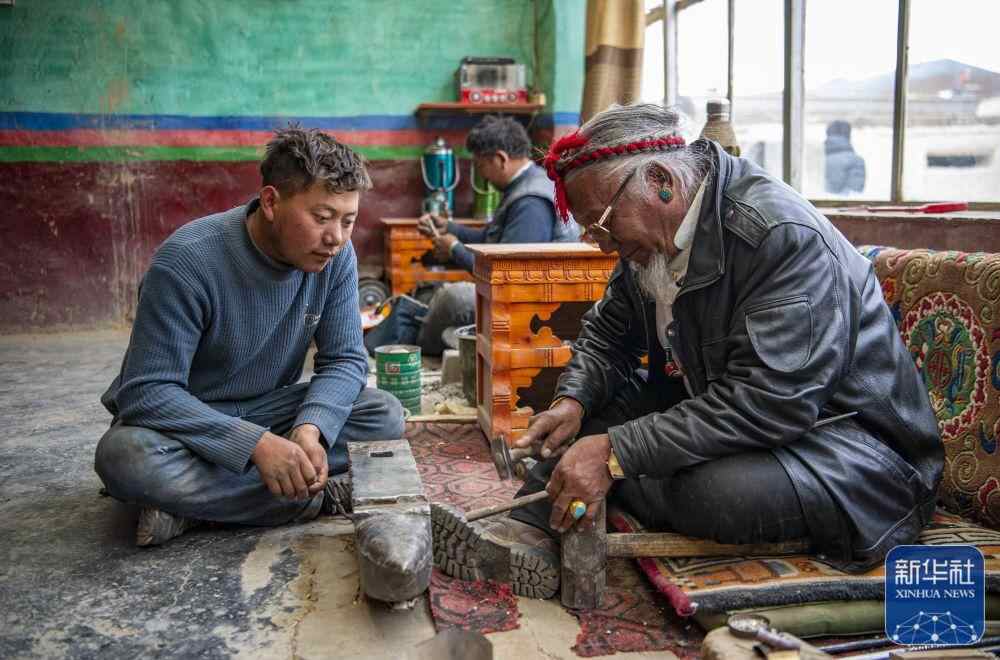 在拉孜县柳乡孜龙村,次旦旺加(右)在指导孙子制作藏刀(3月17日摄)。