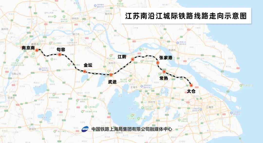 江苏南沿江城际铁路从南京南站向东引出,经南京、镇江、常州、无锡、苏州终至太仓站,线路正线全长278.53公里,设计时速350公里。全线共设南京南、句容、金坛、武进、江阴、张家港、常熟、太仓8座车站,主要承担沿线与沪宁部分城市间的城际客流。