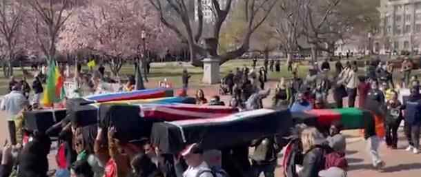 当地时间3月18日,数百人在美国白宫附近的拉斐特广场举行反战集会,一些人抬着盖有乌克兰、伊拉克、叙利亚等国国旗的“棺材” 图片来源:俄罗斯《消息报》视频截图