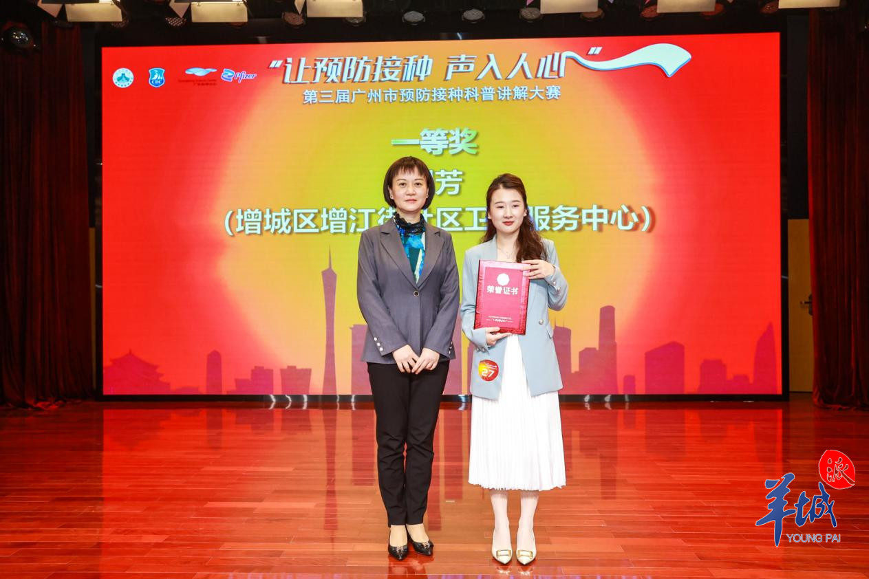 来自增城区增江街社区卫生服务中心的刘芳获得一等奖;海珠区瑞宝街社区卫生服务中心陈奕玲、天河区石牌街道社区卫生服务中心胡婷、南沙区南沙街社区卫生服务中心巫仁君共3名选手获得二等奖;白云区疾病预防控制中心毛亿华、广州市疾病预防控制中心唐琳、番禺区石碁镇社区卫生服务中心李晶、天河区冼村街道社区卫生服务中心张君贤、增城区正果镇卫生院姚秋羽、天河区冼村街道社区卫生服务中心谭莉璇共6名选手获得三等奖;其他选手获得预防接种优秀科普使者。