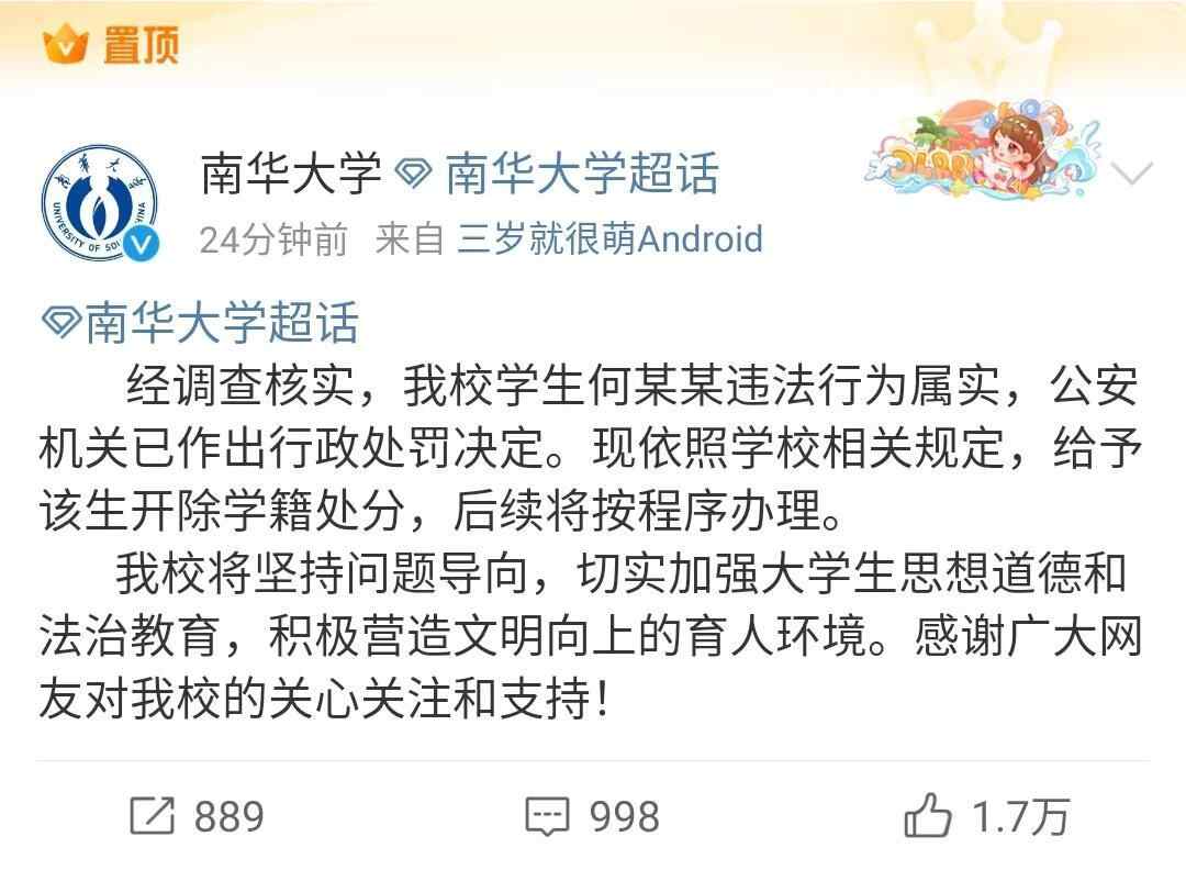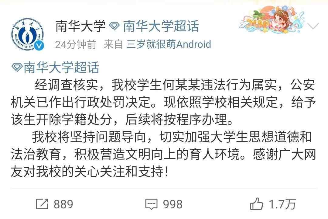 经调查核实,我校学生何某某违法行为属实,公安机关已作出行政处罚决定。现依照学校相关规定,给予该生开除学籍处分,后续将按程序办理。 我校将坚持问题导向,切实加强大学生思想道德和法治教育,积极营造文明向上的育人环境。感谢广大网友对我校的关心关注和支持!