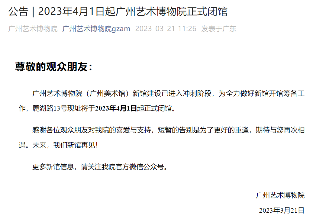 3月21日,广州艺术博物院发布公告:4月1日起,广州艺术博物院正式闭馆,新馆建设已进入冲刺阶段。