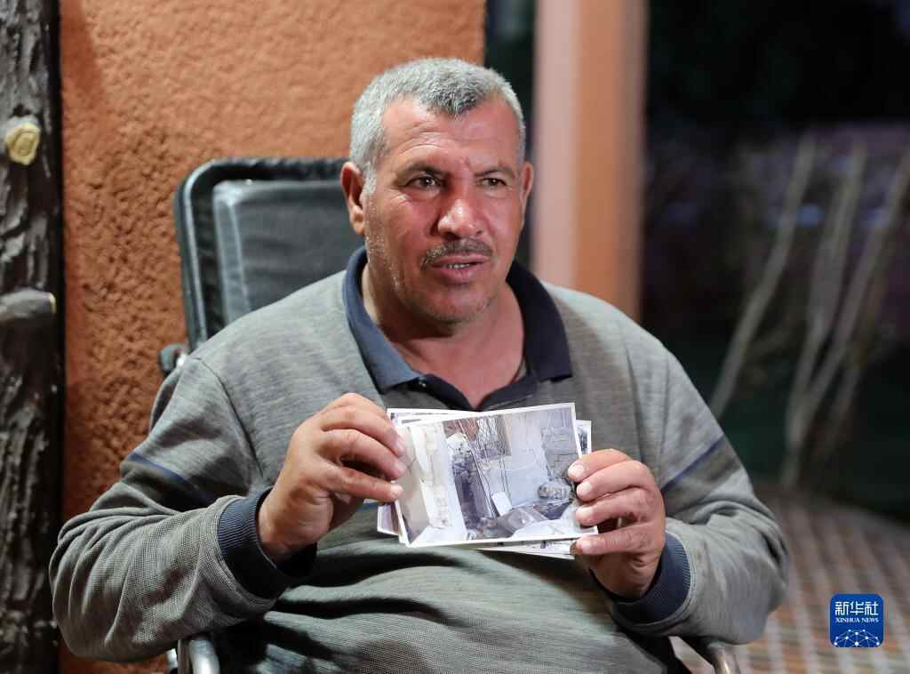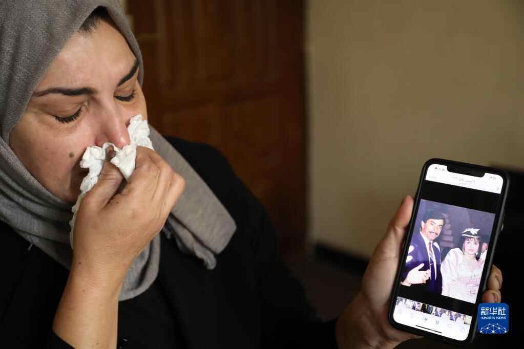2月14日,在伊拉克北部萨拉赫丁省祖卢耶镇,松杜丝·拉米展示她和丈夫阿米尔的合影。新华社发(哈利勒·达伍德摄)