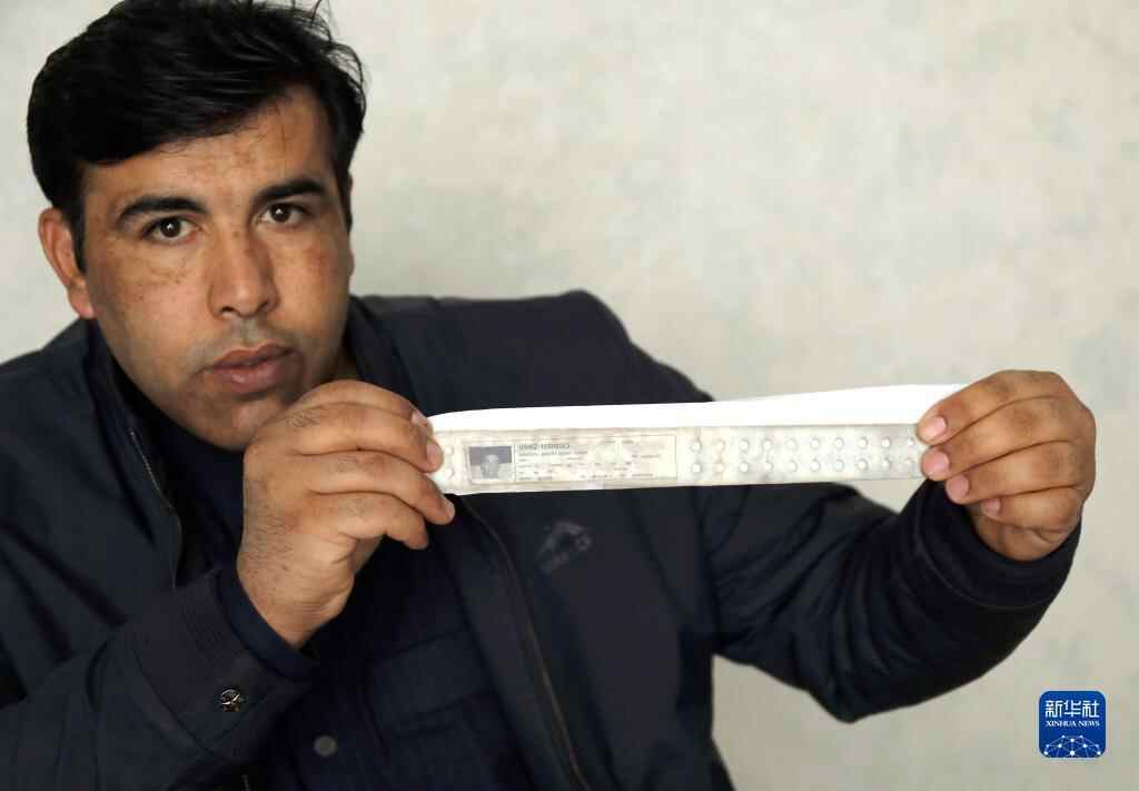 2月17日,在伊拉克北部萨拉赫丁省祖卢耶镇,阿拉·卡里姆·艾哈迈德展示他在被关押期间所戴的印有个人照片和信息的身份识别手环。新华社发(哈利勒·达伍德摄)