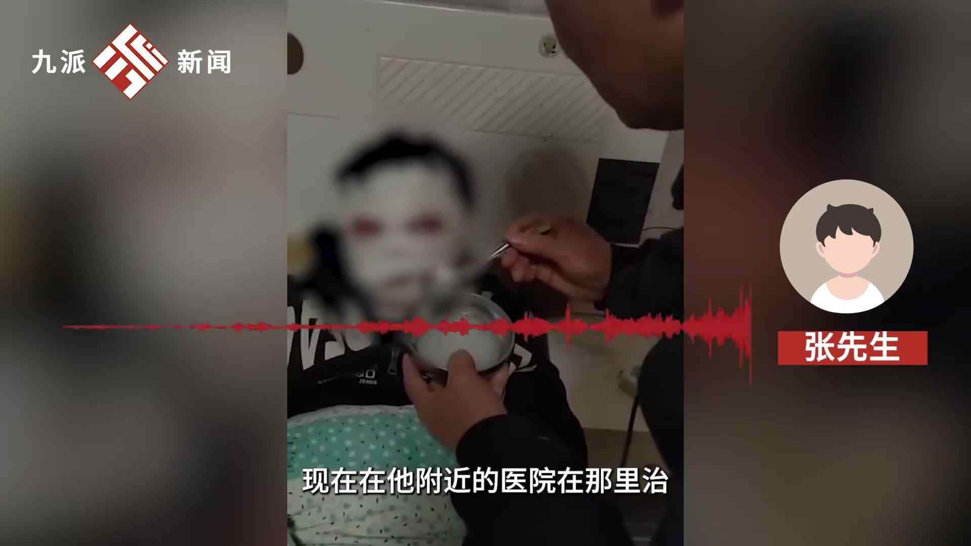 孩子表叔张先生表示,孩子家庭困难,现正在附近医院治疗,脸部被炸黑不能动,手也被炸肿了,现在只能吃稀饭。