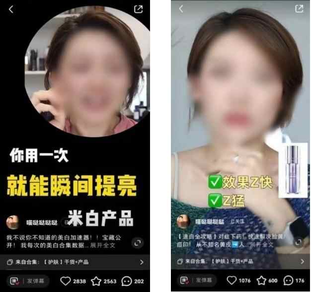 博主在视频作品中对两款护肤产品进行夸大宣传,使用绝对性词语对产品进行相关描述。视频作品中提到“用一次就能瞬间提亮”以及“效果最快、最猛”。存在夸大产品功效,虚假宣传的现象。