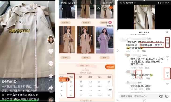 博主对玲玖风衣进行测评推荐,在作品阐述中强调该款风衣特别适合小个子,70979型号衣长只有93CM。经查阅该商家产品数据,显示与实际尺寸不符。同时,在作品评论区部分用户反映较为强烈,表示实物与博主测评视频中展示存在出入。