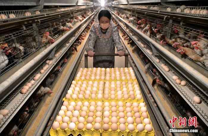 资料图:“中国蛋鸡之乡”河北馆陶 “智慧化”养鸡,年产鲜蛋27亿枚。图为邯郸市馆陶县一家蛋鸡养殖场的工人在运鸡蛋。