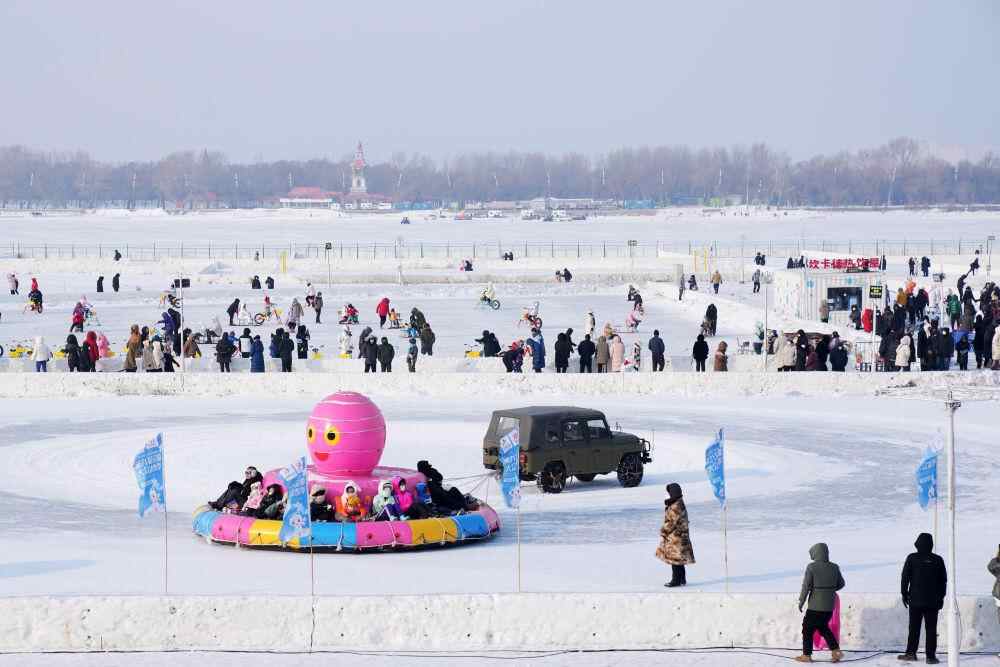 在黑龙江省哈尔滨松花江冰雪嘉年华园区,游客在体验冰雪娱乐项目(1月22日摄)。新华社记者 王建威 摄