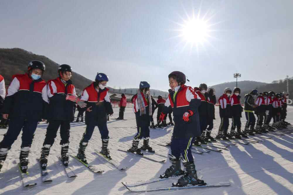 在吉林省吉林市万科松花湖度假区,吉化第九中学学生在滑雪体育课上练习(2月27日摄)。新华社记者 许畅 摄