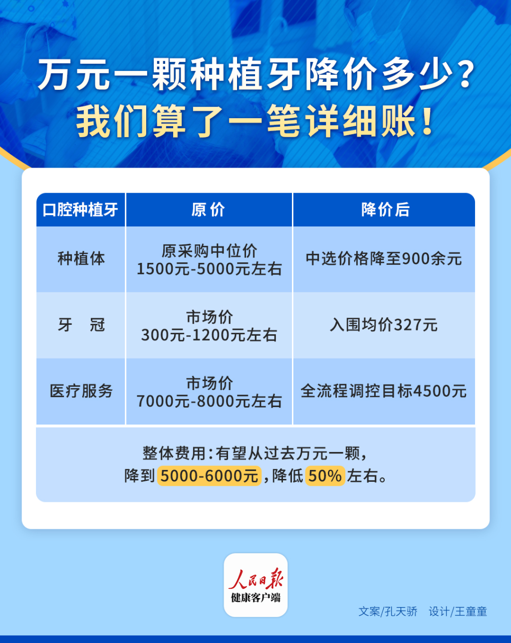 综上粗略算来,完整种植一颗牙的整体费用,有望从过去万元一颗,降到5000-6000元,降低50%左右。