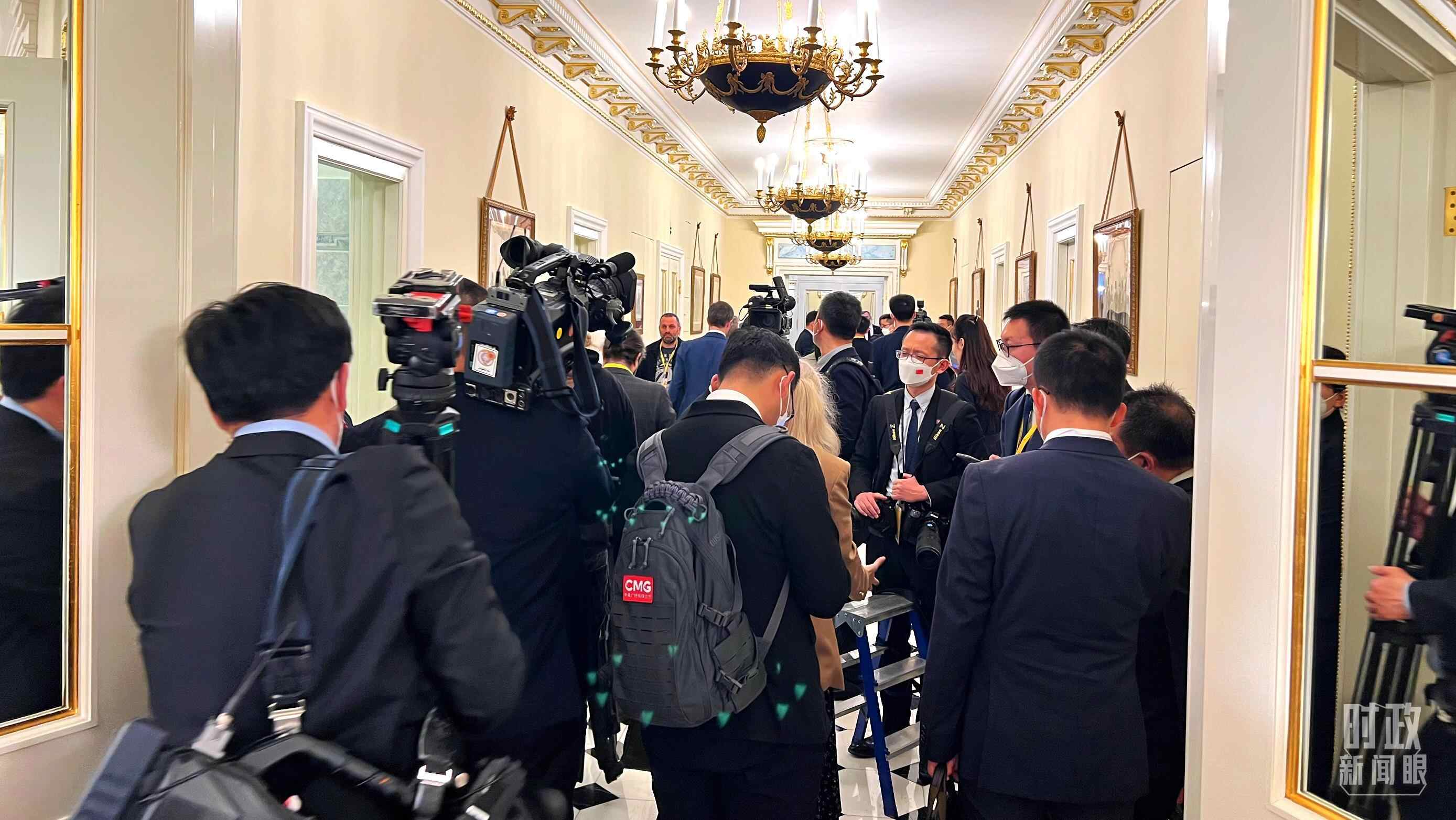 △等待中俄两国元首共见记者的中外媒体同仁。(总台央视记者段德文、李辉拍摄)