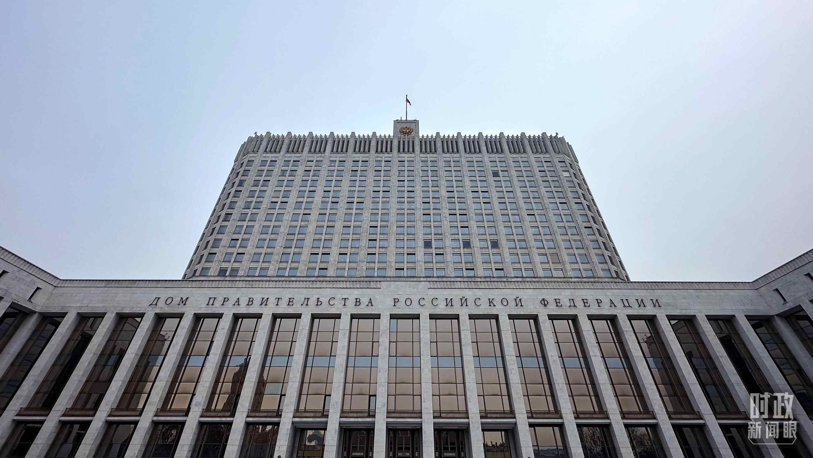 △俄罗斯联邦政府大厦门口两侧悬挂中俄两国国旗。(总台央视记者韩锐拍摄)