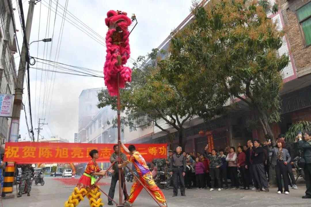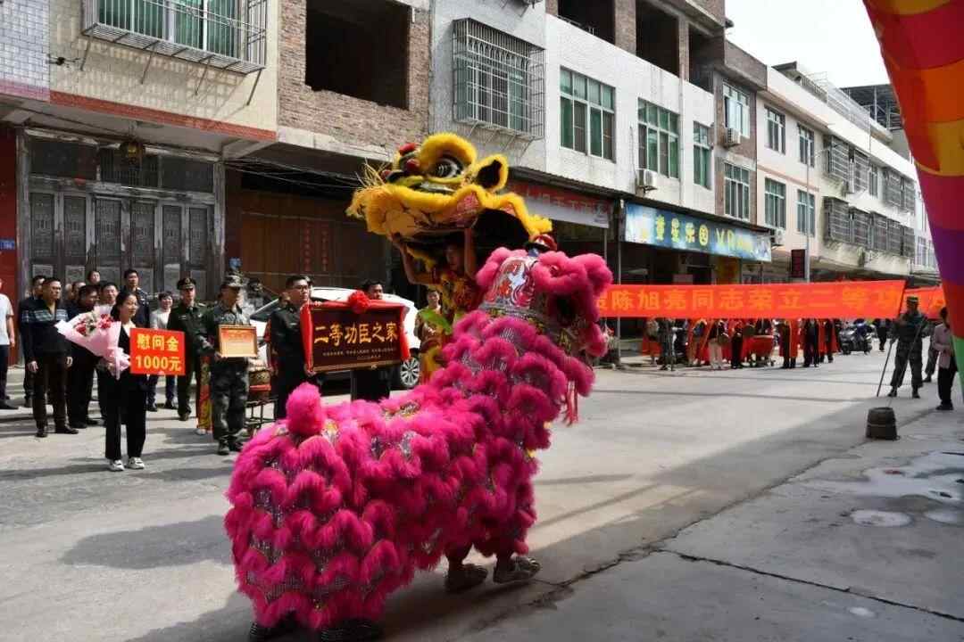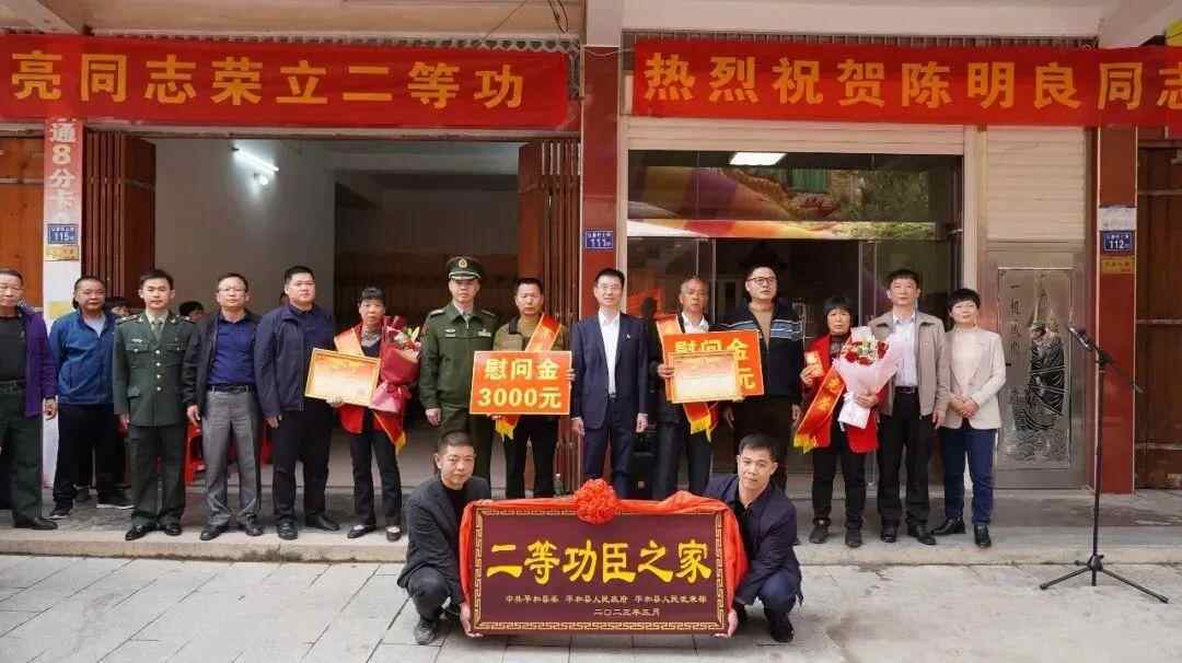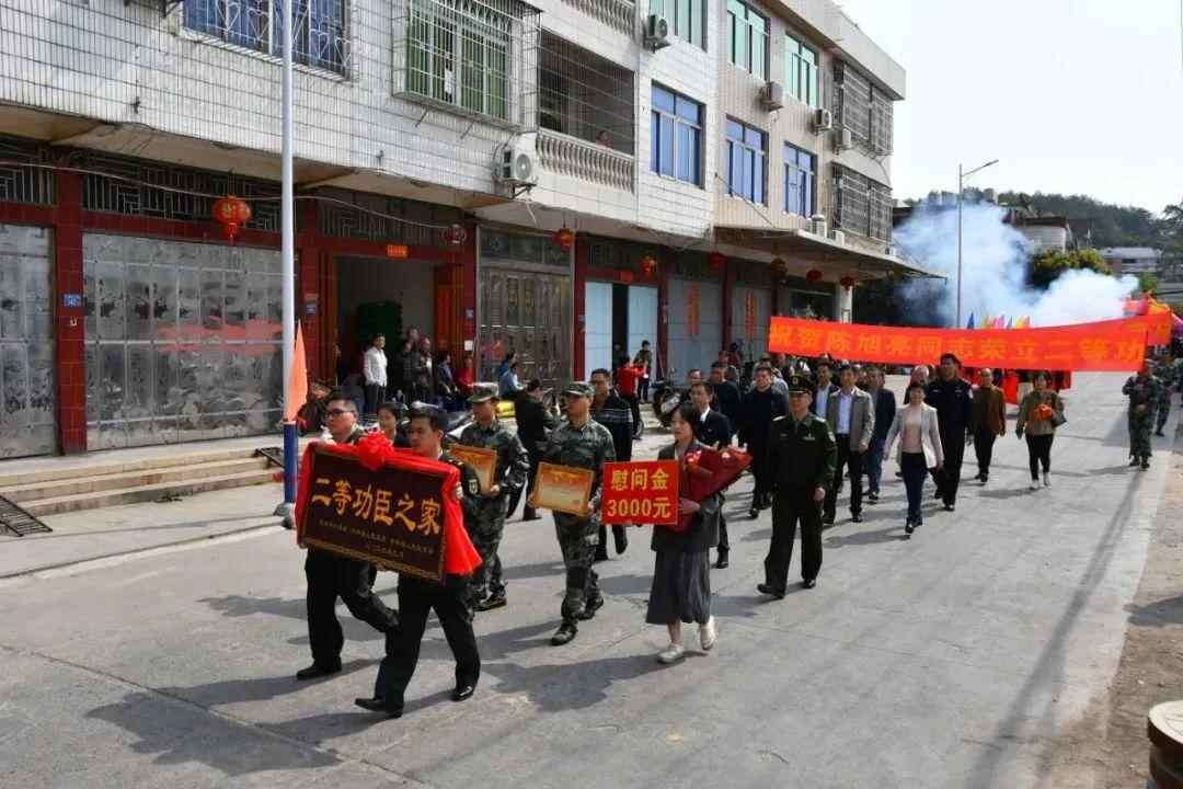 “二等功臣之家”牌匾、三等功的喜报在民兵们的护送下,敲锣打鼓来到陈明良兄弟俩家中,一时间,围观的乡亲越来越多,“功臣”家里如同过年一样热闹。