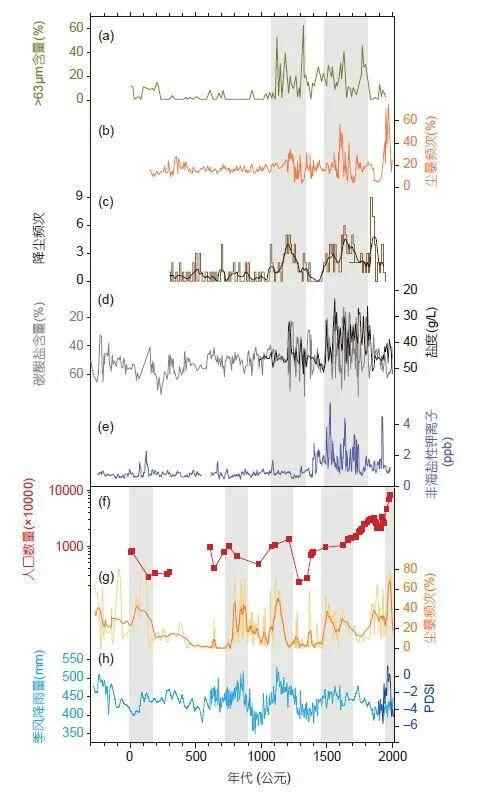 北宋徽宗太学博士陈与义留下过“如何得与凉风约,不共沙尘一并来”的诗句,来吐槽自己遭遇沙尘暴突袭的倒霉运气。下图是根据高分辨率岩芯重建的过去2000年中国东西部沙尘暴记录的对比,揭示出中国北方存在两种沙尘暴演化模式:西部地区的沙尘暴主要受控于自然气候的变化,人类活动的影响直到近代才表现出来,而人类活动在2000年前就成为了中国东部地区沙尘暴的主控因素。