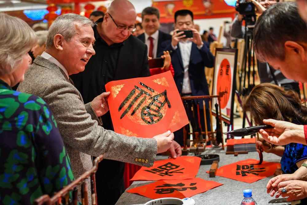 ↑2023年1月20日,来宾在俄罗斯莫斯科举行的“欢乐春节—中国文化庙会”活动上接到福字。中俄两国人文交流日益密切,中俄友好社会民意基础愈加稳固。