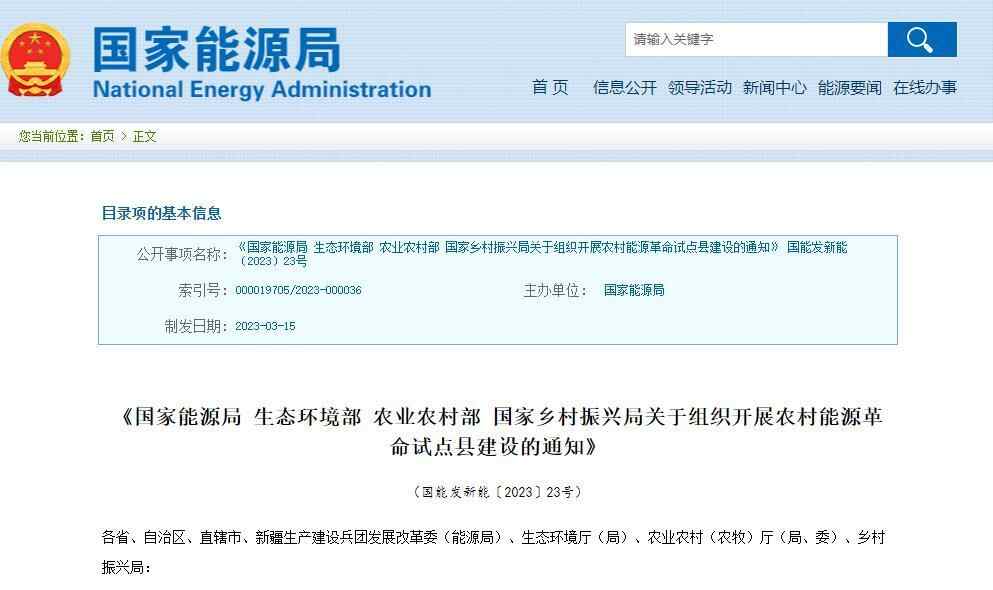 为深入贯彻落实党中央、国务院决策部署,加大乡村清洁能源建设力度,助力全面推进乡村振兴,国家能源局、生态环境部、农业农村部、国家乡村振兴局决定联合组织开展农村能源革命试点县建设。有关事项通知如下。
