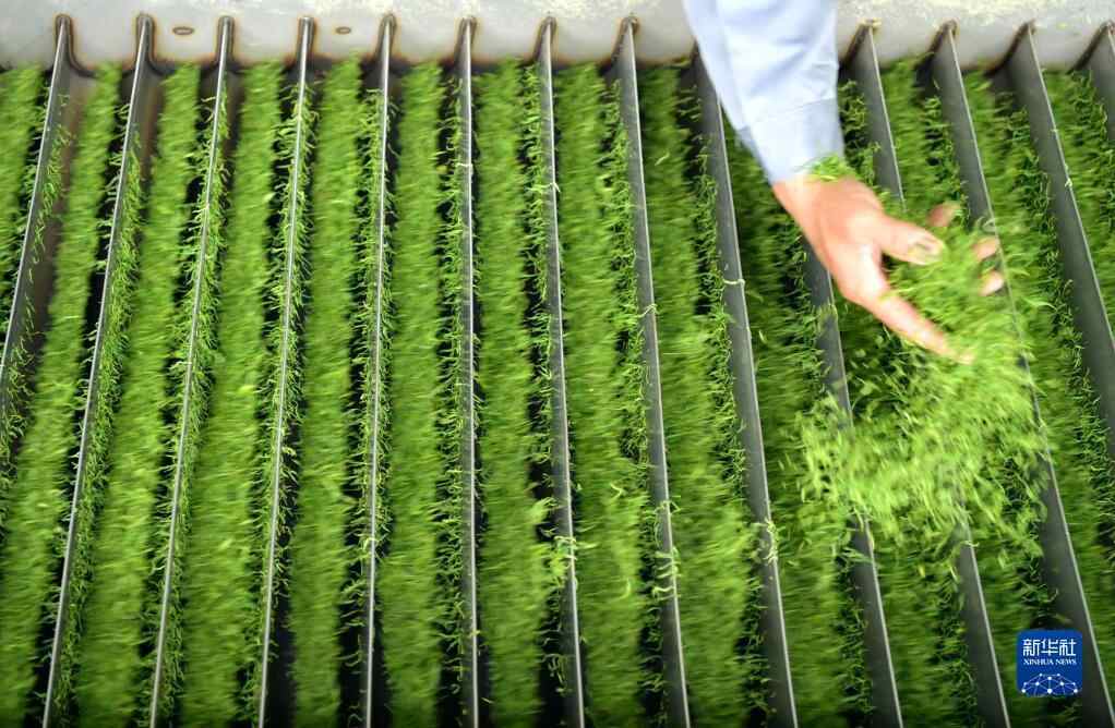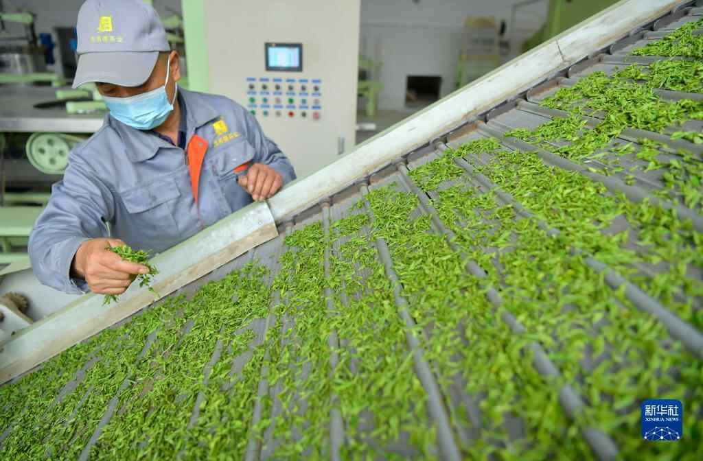 3月22日,在湖北省宣恩县椒园镇一茶叶加工厂,工人在检查传送带上的茶叶。