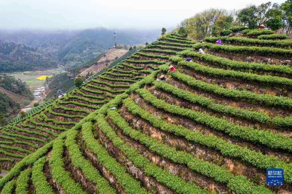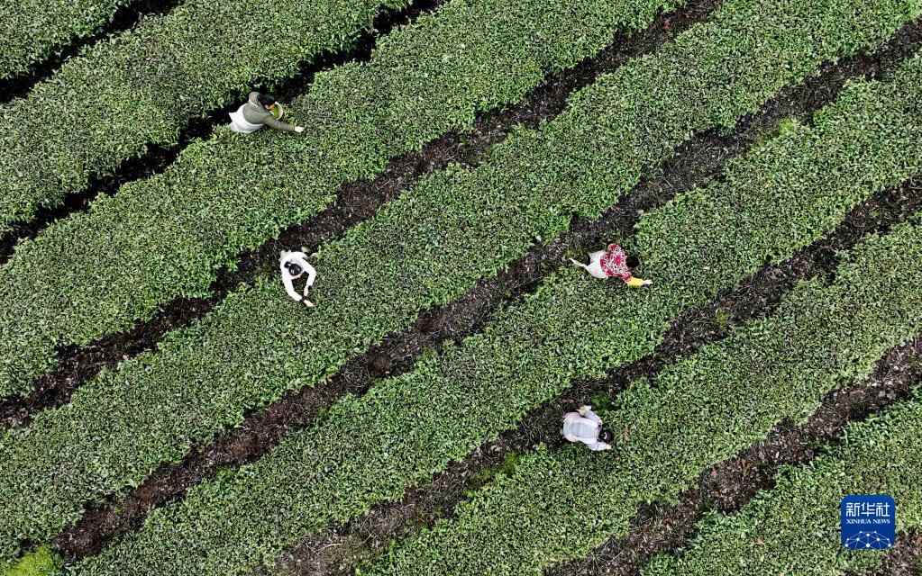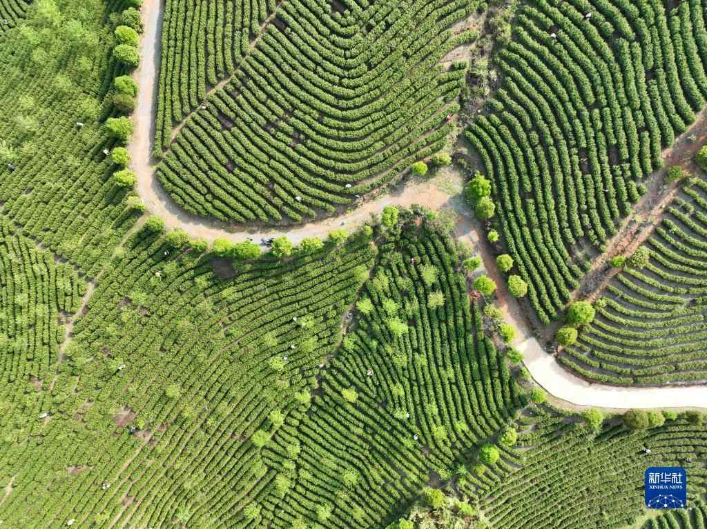 3月21日,在湖南省永州市江华瑶族自治县桥市乡大鱼塘村,茶农在茶园采茶(无人机照片)。