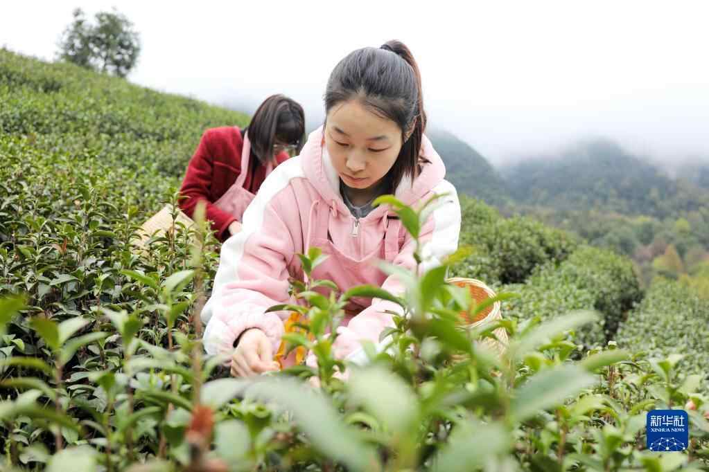 3月21日,茶农在贵州省绥阳县小关乡大寨村的茶园种植基地里采茶。