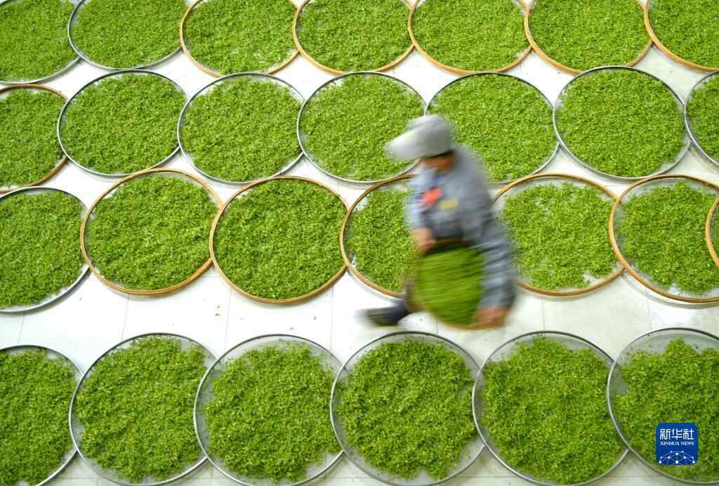 3月22日,湖北省宣恩县椒园镇一茶厂的工人在摊晾茶叶鲜叶。