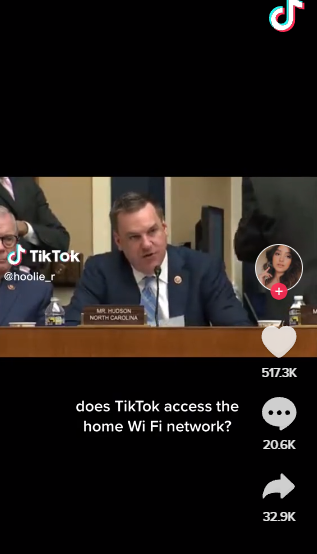 来自北卡罗来纳州的共和党众议院理查德·哈德森(Richard Hudson)向周受资发问:“TikTok能接入家用WiFi(无线网络)吗?”