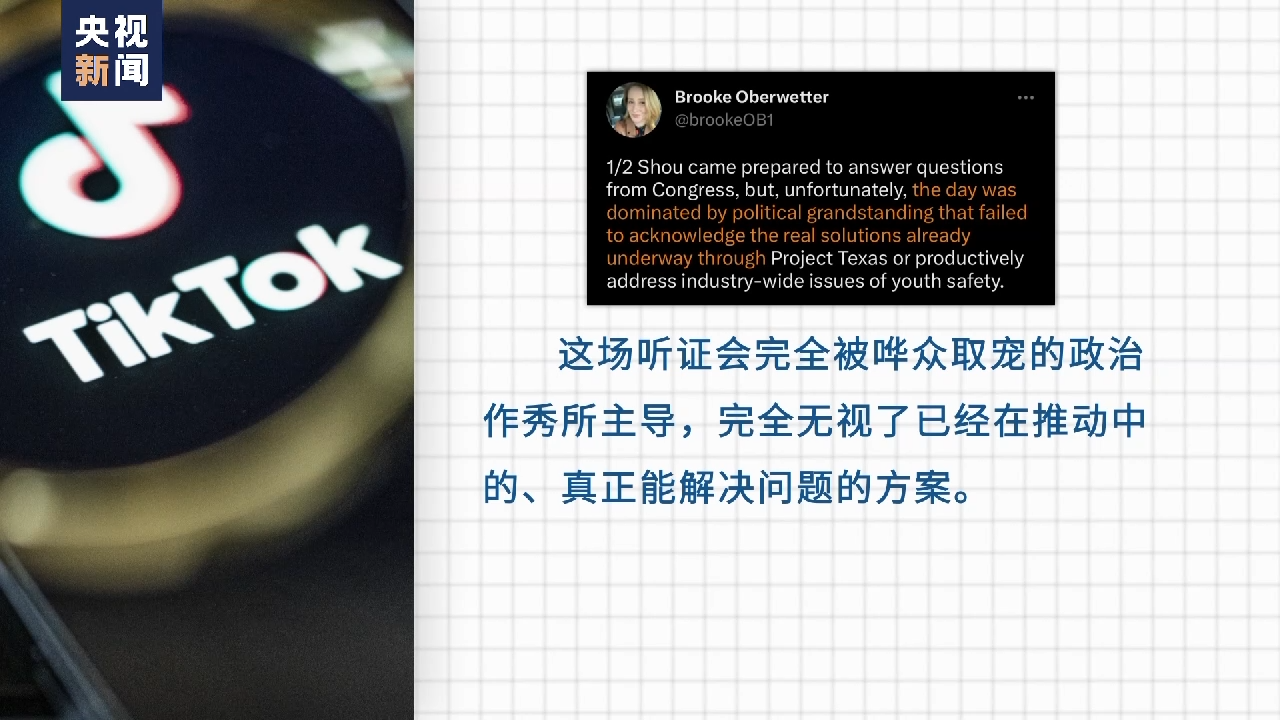 TikTok发言人在听证会结束后的一份声明中表示,“这场听证会完全被哗众取宠的政治作秀所主导,完全无视已经在推动中的、真正能解决问题的方案。”《华盛顿邮报》也用“好战”一词来形容听证会上的美国国会议员们的表现,并报道称,迄今为止这些国会议员们并未提供任何证据,证明TikTok危害了美国的国家安全。