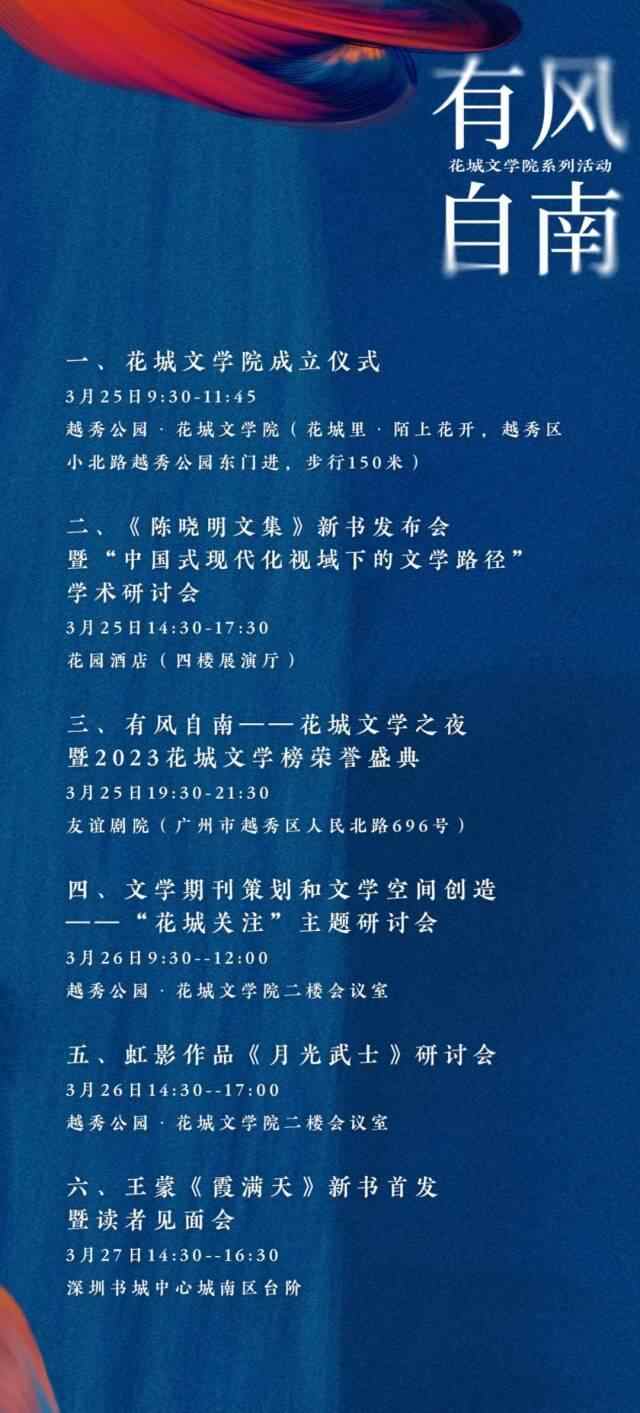 以文化为支点,撬动广东高质量发展。围绕花城文学院成立这一重要节点,一系列精彩纷呈的文学活动为羊城读者送上“文艺大餐”。3月25日下午,《陈晓明文集》新书发布会暨“中国式现代化视域下的文学路径”学术研讨会即将举办;当晚,“有风自南——花城文学之夜暨2023花城文学榜荣誉盛典”将在广州友谊剧院举办,揭晓10部入选“花城文学榜”的优秀文学作品,点亮南国璀璨。