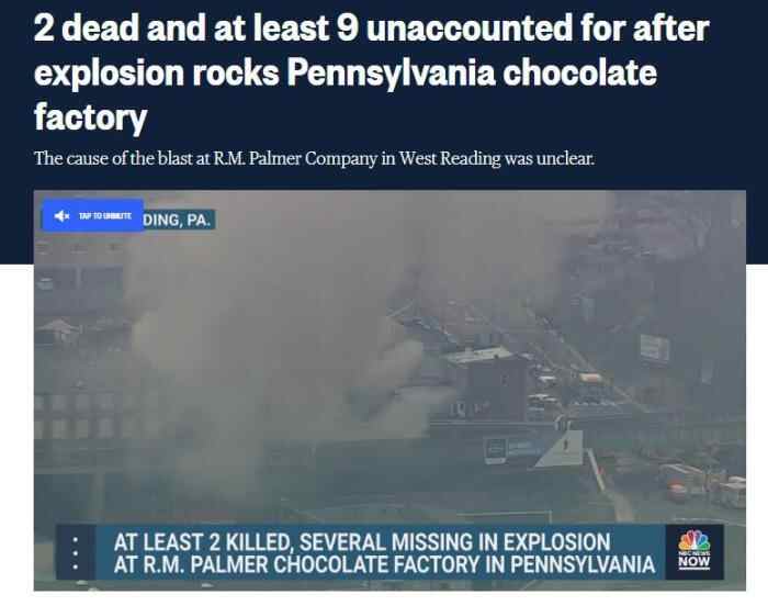 西雷丁警察局局长韦恩·霍尔本证实,巧克力工厂爆炸已造成2人死亡,9人失踪。宾夕法尼亚州紧急事务管理署发言人还称,大约有六到八人被送往医院接受治疗。