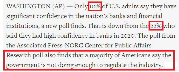 美联社与芝加哥大学公共事务研究中心联合进行的最新民调发现,只有10%的美国成年人对美国的银行和金融机构有很大信心,而2020年这一比例为22%。