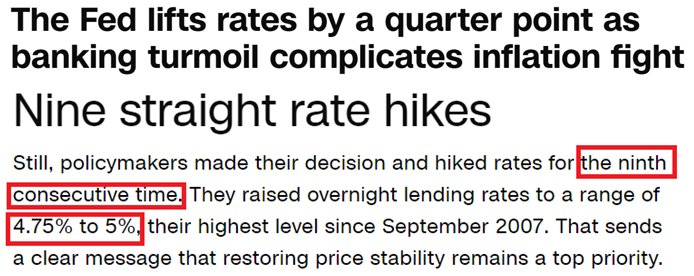 在反复纠结之后,美联储联邦公开市场委员会在22日结束的货币政策会议上还是宣布再次加息25个基点,将联邦基金利率目标区间提升到4.75%至5%之间,达到2007年10月以来的最高水平。