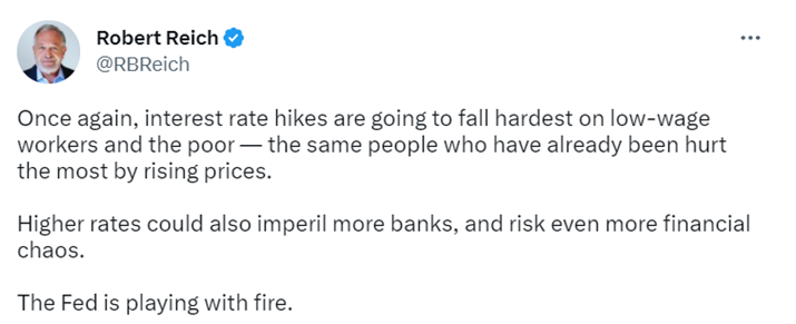 美国前劳工部长罗伯特·赖克在美联储宣布加息当天,就在社交媒体上发文警告:“加息将对低薪员工和穷人群体造成严重影响,而这些人本已受到物价飞涨带来的重创……美联储正在玩火。”
