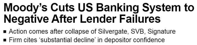 本月早些时候,美国3家银行在一周内接连关闭;获得大笔救命钱的第一共和银行依然处境不佳,其信用级别已被全球三大评级机构下调至垃圾级;不仅如此,穆迪还因“经营环境迅速恶化”,将美国银行业前景从稳定下调至负面。