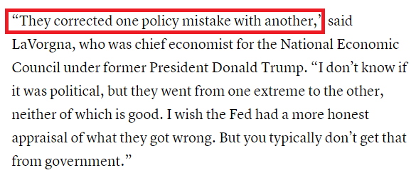 在美国国家经济委员会前首席经济学家约瑟夫·拉沃尼亚看来,美联储是在“用一个错误去纠正另一个错误”,而这或许与“政治有关”。