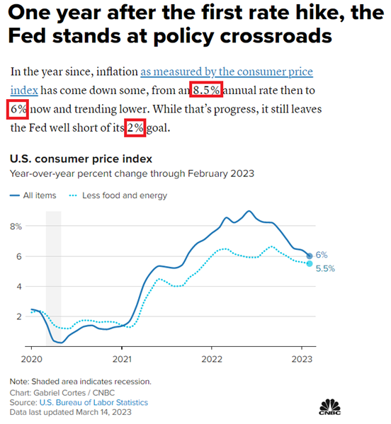 数据显示,去年3月美联储开始加息时,美国的通胀率高达8.5%;到今年2月,通胀率仍维持在6%,离2%的目标“还有很远”。