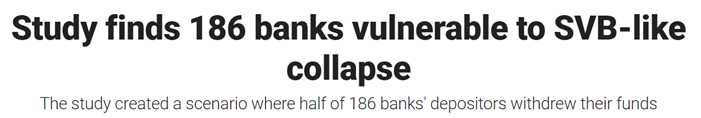 受此影响,美国至少有186家银行面临与硅谷银行类似的境况,届时即使只发生小规模的挤兑,也将有更多银行面临“爆雷”。
